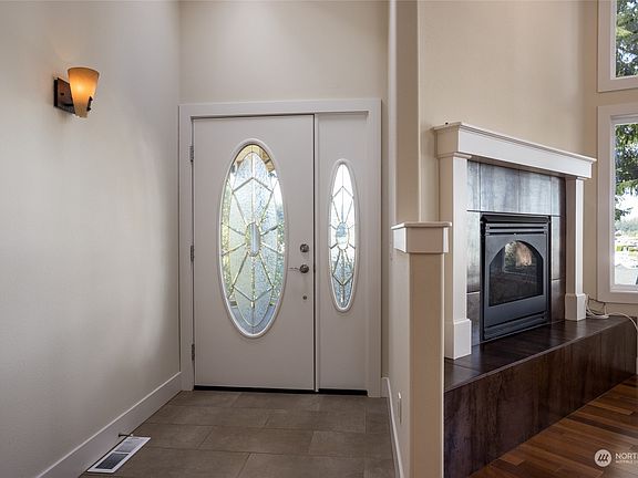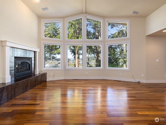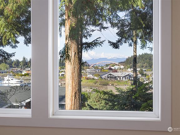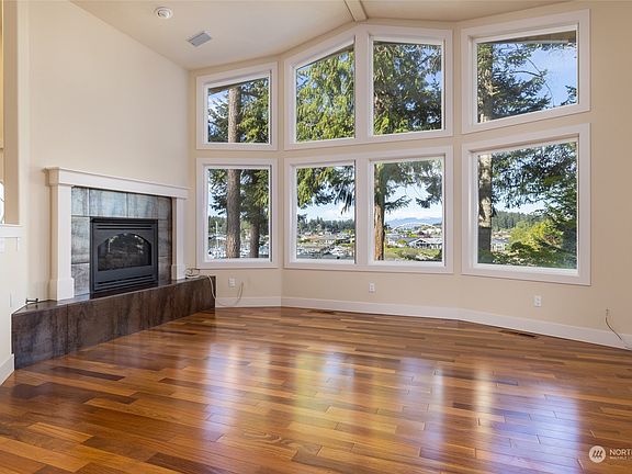Grandly perched on a wooded lot, this 4 bedroom 2.75 bath home embodies the natural & beautiful ambiance of Shelter Bay. Upon entry, the home welcomes you w/the warm glow of richly-hued hardwood floors, cathedral-inspired windows that frame the iconic Rainbow Bridge with Mount Baker in the distance. A well-equipped kitchen w/granite countertops, a double oven, gas cooktop, dining area. An adjacent room that would be ideal as a cozy library/study/tv room, a 3/4 bath, bedroom. The primary bedroom features a walk-in closet, spa-inspired ensuite bathroom, main floor laundry rm.The lower level has 2 spacious bedrooms, a full bath, bonus hobby space/artist nook. Enjoy the mature trees & minimal yard work in the peaceful setting this home conveys.