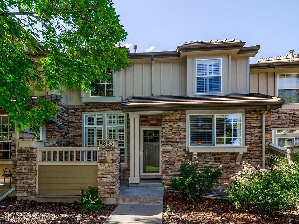Stunning low-maintenance townhome located in Birkdale at Highlands Ranch Golf Club. Light and bright featuring an open floor plan, vaulted ceilings, hardwood floors and plantation shutters on every window! The main level is perfect for entertaining family and friends with a beautiful kitchen that boasts 42' cherry cabinets, new dishwasher, and neutral tile countertops. Retreat to the great room and cozy up next to the gas fireplace with soaring ceilings that extend to the upper level. You'll appreciate the two large bedrooms including a master suite with his and her closets and luxury 5-pc bath. The loft is also the perfect place to relax and read a book at the end of day. Step downstairs and discover a professionally finished basement complete with a large rec room suitable for a home theater or additional bedroom and storage area. Great location near the new UC Health Highlands Ranch Hospital, community rec centers, Town Center and easy access to C-470 and Santa Fe.