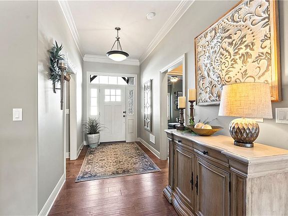 Welcome to this stunning Rev 1.5 Story featuring a custom expanded three car garage, perfect for oversized vehicle or a boat! Nestled on a peaceful street, this home backs onto greenspace adorned with a natural tree line, making it even better than new! As you step inside, you’ll be welcomed by an open-concept floor plan filled with sunlight streaming through large windows. The exquisite details will surely captivate you, featuring crown molding, gleaming hardwood floors, and custom plantation shutters. The breathtaking kitchen showcases an oversized island, custom cabinetry, a gas stovetop, elegant granite countertops, and a walk-in pantry. The dining room boasts a custom built-in buffet and a beautifully crafted wood ceiling feature. The expansive primary suite is a true retreat, complete with a spa-like bathroom that includes a zero-entry shower, double vanity, and a walk-in closet.