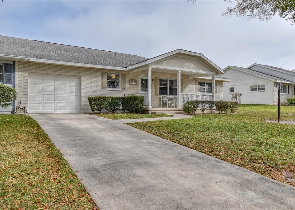 This tastefully renovated end-unit Birmingham model is located in the highly sought after 55+ golf course community of On Top of the World. A large front porch greets you, through which you enter this home’s oversized living room. You will immediately feel as if you stepped into a model home. Just about everything has been updated, from the popcorn that was removed from the ceilings to the newer luxury plank vinyl and oversized tile flooring, modern bathrooms, newer window blinds and curtains, front door with leaded glass insert, stainless-steel appliances, plus contemporary fans and fixtures. To your right of the home, you will find a king-sized master bedroom, which has an oversized walk-in closet. Both the master and the 2nd bathroom were completely remodeled and have beautifully tiled walk-in showers with benches, new cabinets and comfort height toilets. The light and bright 2nd bedroom offers plenty of space and a good-sized closet. On the other side of the home, you will find a renovated kitchen with white cabinets, newer stainless-steel appliances and tiled backsplash; even a large bonus area under the kitchen window for a breakfast nook, crafts area or work desk. The large adjoining dining room leads you into the enclosed tiled lanai, which is under heat and air. To the left of the lanai is an additional screeded in area and to the right there is a patio, perfect for a BBQ or outdoor entertaining. Elongated tandem garage (13' x 37') will fit a car plus a golf cart; it features newer Maytag washer and dryer, utility sink and pull-down attic stairs. Newer Roof 2017. The monthly HOA fee includes basic cable, exterior maintenance and irrigation, 24/7 guarded gates and all the amenities that OTOW has to offer; swimming, tennis, fitness classes, pickleball, archery, billiards, softball, 175+ resident clubs and much more! A golf cart community with access to three shopping centers and multiple restaurants.