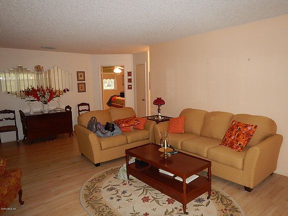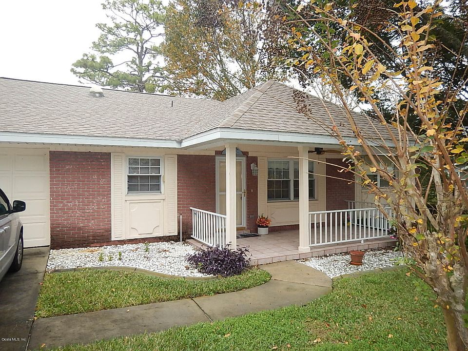 Wonderful Birmingham model with beautiful covered entry, perfect for those porch rockers or porch swing! This is an end unit with 2 bedrooms, 2 baths and a 1.5 car garage in Americana Village. It features laminate floors, updated windows, large enclosed lanai, newer roof, newer A/C unit, 2 solar tubes and newer washer and dryer. This spacious home has been well maintained. Golf cart included with full price offer! Located in Ocala's premier, gated, 55+ community, loaded with amenities, including golf cart access to two shopping centers.