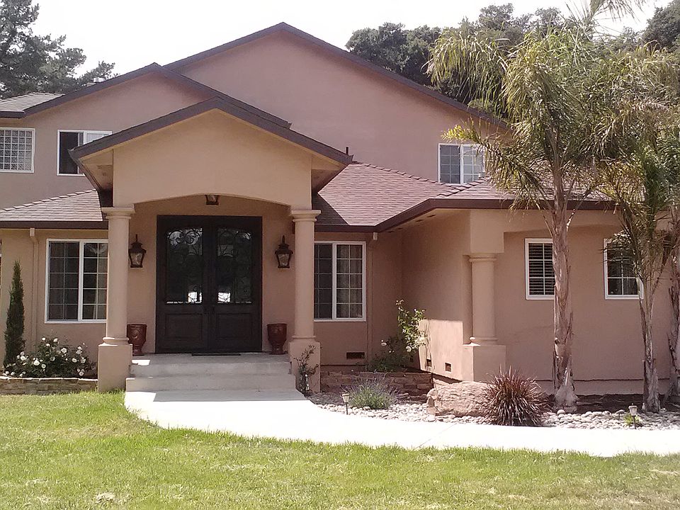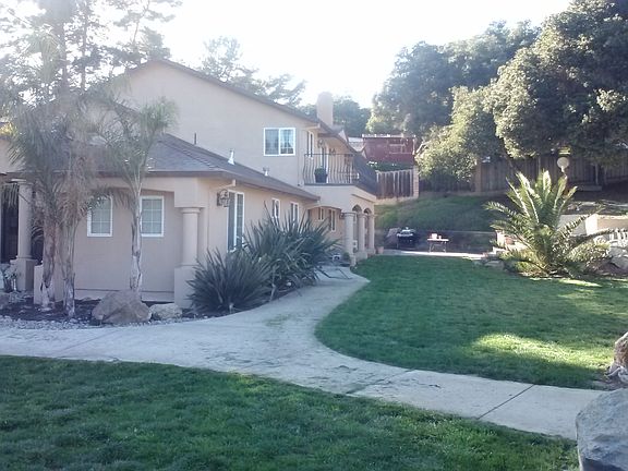 Stunning 4400 sq ft home located high on Holly Hill offers spectacular views to Fremont Peak. With barn and 3 car garage on sprawling 5 acre horse property. Downstairs is the formal living room, gourmet kitchen, 4 bedrooms and office. A large outdoor pergola covered patio off the kitchen is perfect for entertaining. The second level has a huge family room, separate home theater room, spacious master bedroom with fireplace and balcony views and huge master bath and expansive walk-in closet. Includes 3 car detached garage and an approx. 25x35 barn. The yard around the home is beautifully landscaped with green lawn, palm trees and succulent garden. Property has a fully fenced pasture, 3 horse stalls and riding arena. Property also has a large garden area with green house. Several fruit trees and many mature oak trees throughout property. Located on a quiet cul de sac road across from state land.