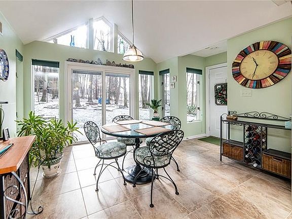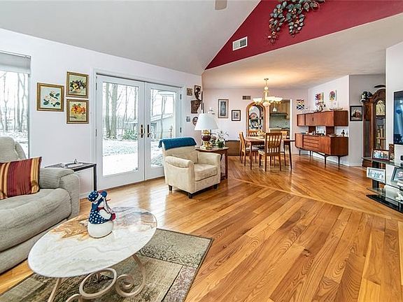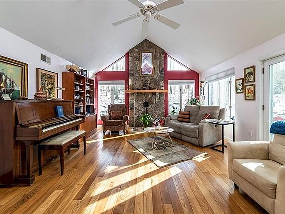 STUNNING CUSTOM CRAFTSMAN STYLE HOME IN PARKLIKE SETTING - 3 BEDROOM, 2 FULL BATH RANCH ON 4.5 PRIVATE ACRES WITH WALL OF WINDOWS IN MASTER BEDROOM; LIVING ROOM, DINING ROOM & BREAKFAST AREAS. CUSTOM KITCHEN: PORCELAIN FLOORING; STAINLESS APPLIANCES; BRAZILIAN GRANITE; MAPLE CABINETS; GLAZED GLASS BRICK MOSAIC & SUBWAY TILE STYLE BACKSPLASH; INDUCTION COOK TOP; BUILT-IN CONVECTION MICROWAVE & OVEN. LARGE EAT-IN AREA W/VAULTED CEILING & SLIDING PATIO DOOR TO FLAGSTONE PATIO. LIVING ROOM: VAULTED CEILING; 3/4" RED ELM FLOORS; FLOOR TO CEILING STONE WOODBURNING STOVE AREA [NO STOVE CURRENTLY], FRENCH DOORS TO STONE WALKWAY & PATIO AREA. DINING ROOM W/ RED ELM HARDWOOD FLOORING. MASTER SUITE: CATHEDRAL CEILINGS; 2 WALK-IN CLOSETS; ENSUITE BATH W/ CUSTOM WALK-IN OVERSIZED SHOWER, SEPARATE GARDEN TUB. 2ND FULL BATH W/CUSTOM WALK-IN SHOWER.ATTACHED 2 CAR GARAGE[24X21].36X30 DETACHED GARAGE/BARN W/ OIL HEAT & WATER. SHED.2 50 GAL OIL TANK -DETACHED GARAGE. CUSTOM WINDOW TREATMENTS INCLUDED.