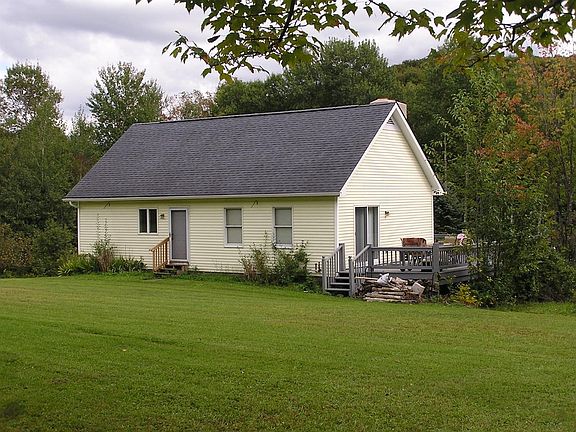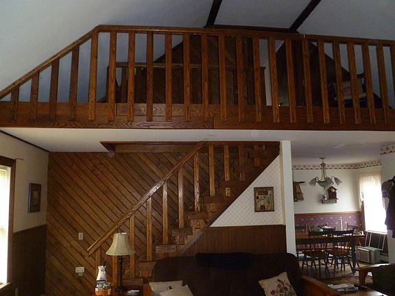 Cape with a chalet and country feel features a cathedralled living room with a second floor balcony and a two story brick chimney for the woodstove. Nice wood walls and balcony features. Huge deck along the whole front of the house and the whole left side with a sliding door entry to the living room. There is a mix of mature and young apple trees throughout the property. Good shed for equipment. Part of the basement could be finished as a den.
