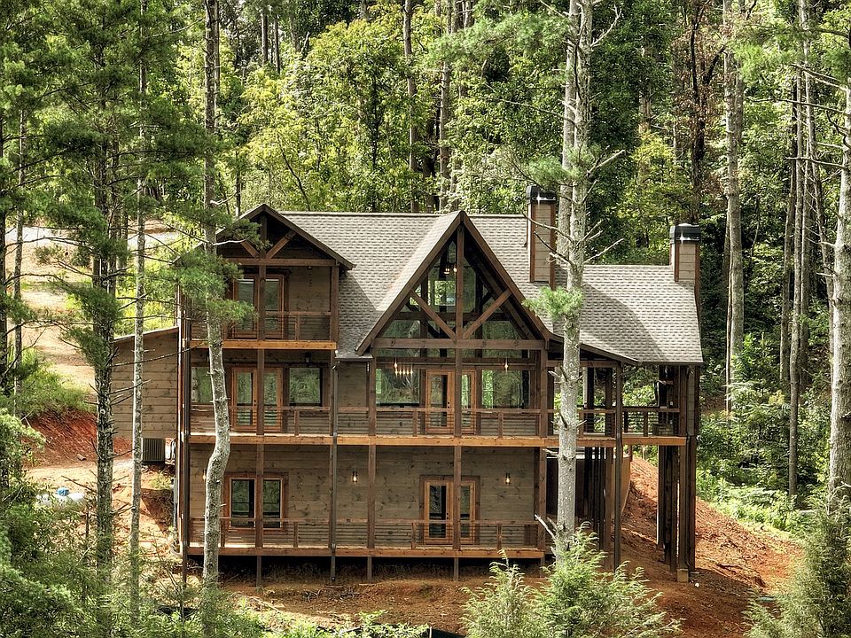 NEW LODGE STYLE Modern Rustic Home with Year Round MOUNTAIN & RIVER VIEWS! Move-In Ready, this 4BR/3.5BA is perfectly situated on 3.47 acres. You can see & hear the river from the 3 levels of porches. Be prepared to be WOWED w/massive post & beam covered porches & a party porch w/outdoor fireplace. Open concept floor plan with soaring cathedral ceiling, beautiful wall of windows & stone fireplace. Well appointed kitchen includes real stone backsplash, an island with 3 custom countertop, handcrafted cabinets & an area for dining. Primary suite has a spa like bath w/stone accent wall & lg walk-in closet. Half bath & laundry are also on main floor. Upper level has a huge LOFT, 2 BR, private porch & full bath. Terrace level includes a huge family/rec room, bedroom & bath. (No HOA fees & STR's are allowed.) Located 6.5 miles from town, all paved rds, super easy access!