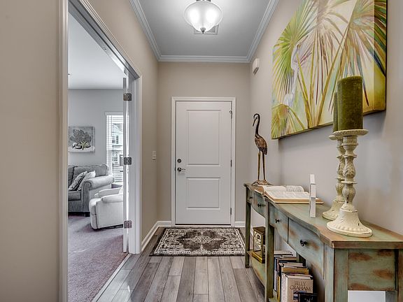 What a fantastic view from this 4BD/2BA home situated perfectly on the lake in Heritage Preserve! From the welcoming front porch to the covered screened porch and additional patio, you'll know you've found paradise! This open floor plan includes the extended great room and spacious dining area. Kitchen features cabinets with crown molding, stainless appliances including double oven, breakfast bar, pantry and recessed lighting. Master bedroom with oversized walk-in closet, en-suite bath with double sinks and walk-in shower. Two more guest bedrooms and bath plus flex room which is the 4th bedroom. Don't forget the outstanding lake view! Upgrades throughout: crown molding and easy-care LVP floors in the main living area and kitchen, tile in the bathrooms and laundry room, gas line is behind the electric range, 2" window blinds, extra attic insulation, gutters, ceiling fans in all rooms, custom landscaping, two additional outlets plus ceiling fan and light on the front porch, 2 security cameras and Ring doorbell, and pull down attic stairs.  Lovingly maintained and ready for a new homeowner!