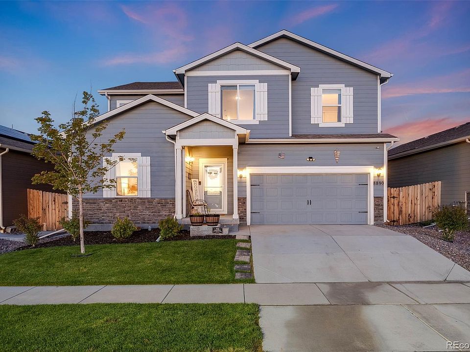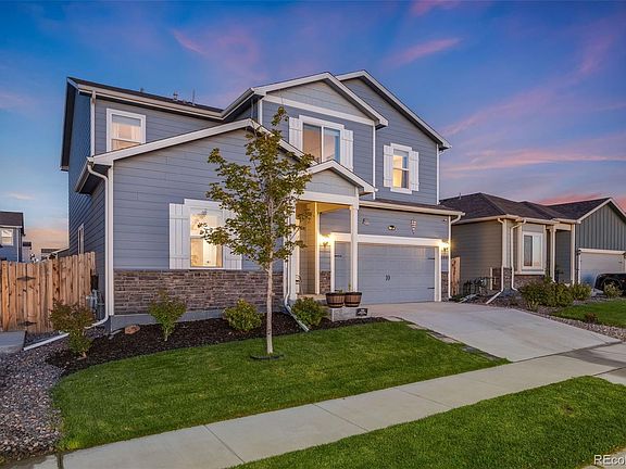 This spacious 5-bedroom, 3-bath home offers an open-concept layout, high ceilings, and mountain views in a peaceful neighborhood. All bedrooms are carpeted, while the rest of the home features luxury vinyl tile. The main floor has a large bedroom and full bath, perfect for guests or an office. The chef’s kitchen boasts granite countertops, stainless steel appliances, and a walk-in pantry. The dining area connects to two large living spaces, ideal for entertaining. Sliding glass doors open to a fully fenced yard with a dog door, landscaped areas, and a large patio. Upstairs, a loft provides stunning sunset views. Four bedrooms include a master suite with a walk-in closet and 5-piece bath. Double insulation in the master and secondary bedroom ensures added comfort. The laundry room is upstairs, along with a full bath. The property includes underground sprinklers, a lined crawl space, and a workroom in the two-car garage that can be removed for parking. Modern conveniences include a whole-house water filtration system, 1 GB wired Wi-Fi, recessed lighting, and ceiling fans. Walk to the Rocky Mountain Arsenal National Wildlife Refuge and enjoy nearby Barr Lake. Secure this home’s 3.625% assumable mortgage for fast closing with Roam—ask the listing agent for details.