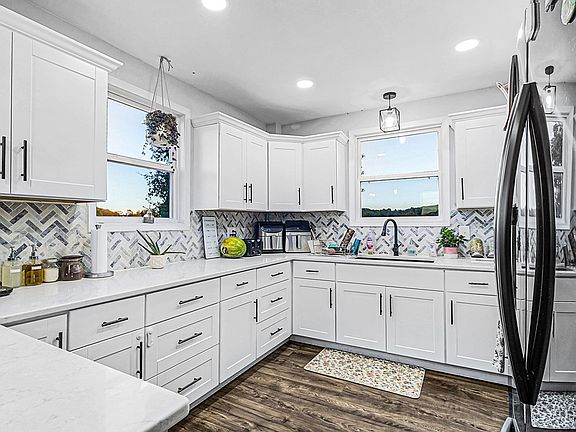We call this one “The Modern Farmhouse Glow-Up”! This 4 bedroom showpiece perfectly blends old-world farmhouse character with fresh, modern luxury. The main level features a fully reimagined kitchen with sleek slate appliances, a marble backsplash, and stylish cabinetry that pairs beautifully with the luxury vinyl floors flowing throughout the home. The open-concept living and dining area creates a seamless space for entertaining or relaxing nights in while a main-floor bedroom, full bath, and spacious laundry and mudroom complete with a unique slate floor. Upstairs, the primary suite takes center stage with a double vanity, walk-in shower with custom tile work, and generous space for relaxation. Two additional bedrooms and another full bath complete the second floor, each enhanced by custom accent walls, wainscoting, and designer touches that elevate the entire aesthetic. Every inch of this home has been rebuilt from the inside out; including new electrical, plumbing, sheetrock, windows, and roof. And just when you think it can’t get any better, step outside to take in the beautiful views in every direction from the covered front porch.This isn’t just a renovation, it’s a reinvention....