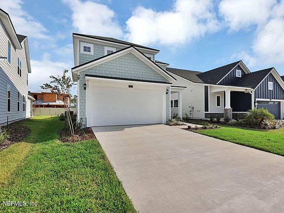 Riverside Homes presents the AUGUSTINE PLAN, located in Crosswinds at Nocatee at the South Entrance of Nocatee walking distance to Pine Island Academy. This READY NOW home invites you inside with a beautiful ¾ glass entry door and soaring 2-story foyer entry, welcoming you into the beautiful home! As you walk through the foyer, you enter into a chef's dream kitchen, with Stainless Steel double ovens, a 36'' gas cooktop with a chimney style hood vent, and gorgeous quartz countertops with pre-wires for pendant lighting over the large kitchen island over looking the family room, where you will find a tray ceiling, large windows and a 12' slider flooding the space with natural light. The owner's suite and a full guest suite are located on the first level, while 3 additional bedrooms, a bathroom, a loft, and a homework nook are perfectly suited for family upstairs. The tandem golf cart garage is perfect to bring your bicycles, scooters, golf cart, and kayaks to enjoy every part ..... The tandem golf cart garage is perfect to bring your bicycles, scooters, golf cart, and kayaks to enjoy every part of the Nocatee Lifestyle! The 8' coastal 2 panel doors and high ceilings are distinctively Riverside Homes. Floor plan in Documents.