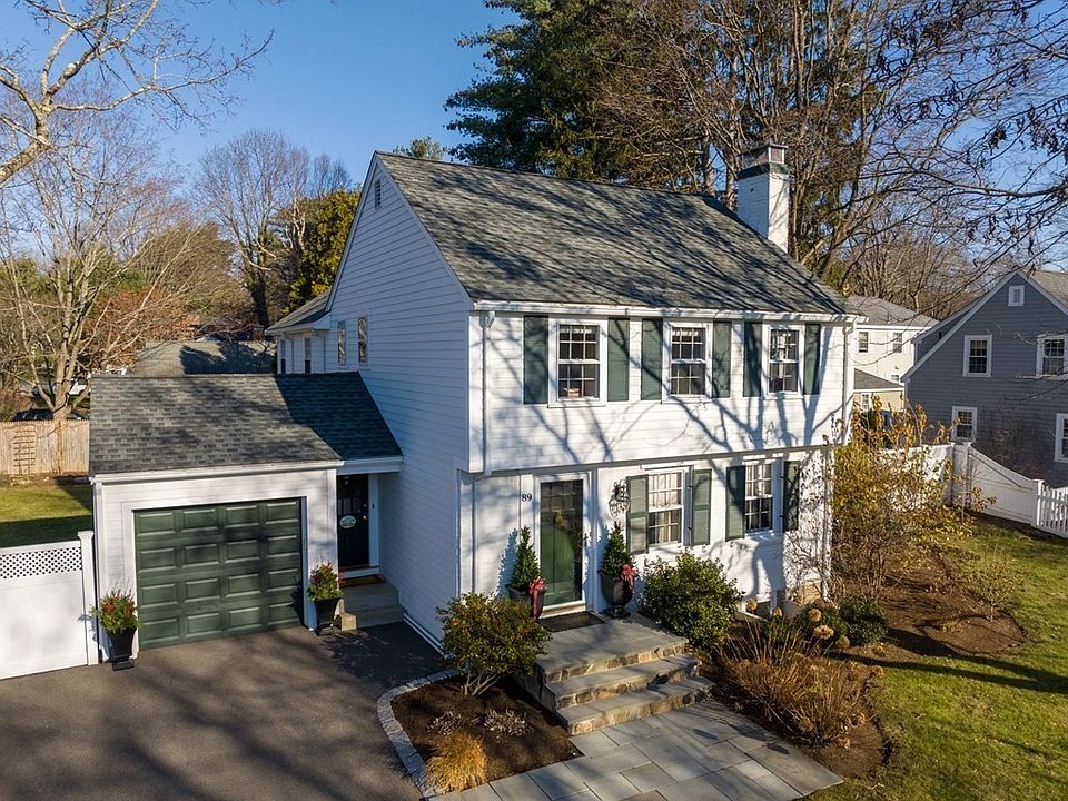 Picture perfect - move right in! Completely updated, charming 4BR colonial in much-loved Fells neighborhood. Corner lot; elegant touches and hardwood floors throughout. Kitchen opens to dining area and features center island with seating, granite countertops, and high-end stainless appliances. Adjoining family room features built-ins and French doors opening onto covered deck and adjacent bluestone patio - perfect for outdoor entertaining. Elegant living room with fireplace, plus an office and powder room complete the first floor. Upstairs primary suite w/cathedral ceiling, marble bath and walk-in closet. Three additional bedrooms and a full bath on second floor. Finished basement features space for playroom or additional office, with built-ins. Fenced-in, level yard has mature landscaped gardens in front and back. Close to Perrin Park, Reeds Pond, and Fells Market. This turnkey home is a must-see!