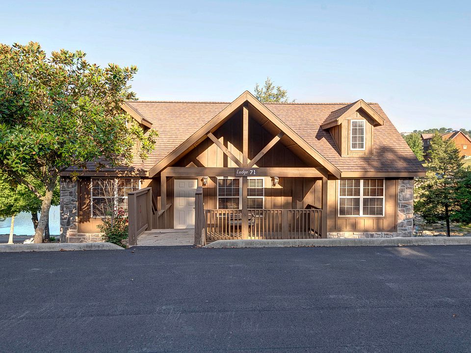 LAKE FRONT VACATION RENTAL LODGE. This lovely cabin sits on the shores of Fox Hollow Lake in beautiful Stonebridge Village, and is just minutes from Silver Dollar City, Table Rock Lake, and all that the Branson/Lakes Area has to offer. Home of the Ledgestone Championship golf course, Stonebridge is a gated, country club community that offers tons of amenities including pools, clubhouse with dining, tennis, playground, sand volleyball, lake pavilion, security, and more. This beautiful and rustic lodge comes furnished and features an open floor plan with gas fireplace, screened in porch overlooking the water, and 2 master suites. This place is perfect for a vacation getaway for your family and friends to gather, a nightly rental investment property, or both!--rent it out when you're not using it! 2021-09-20