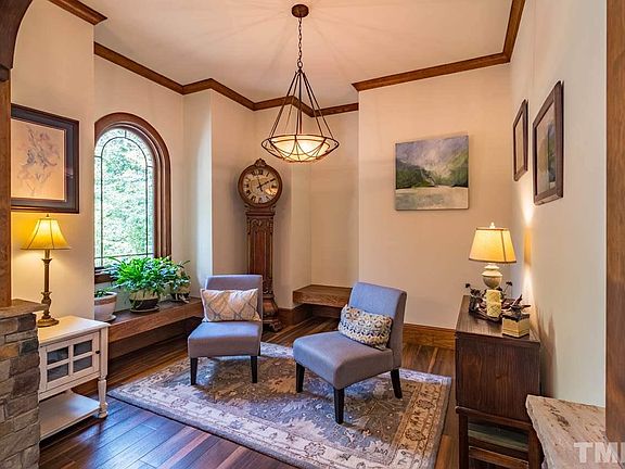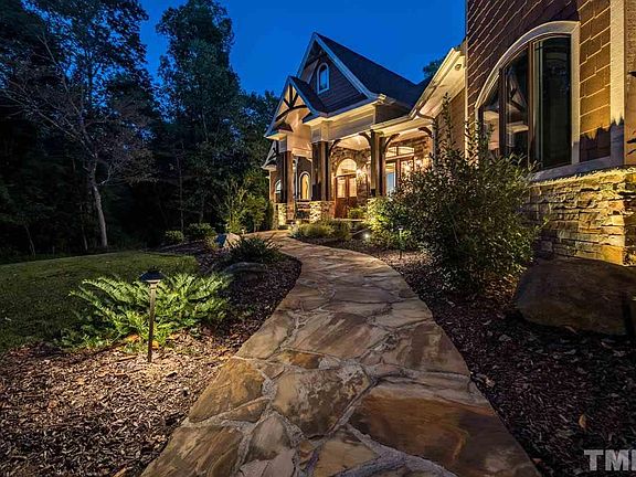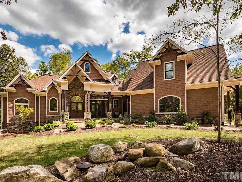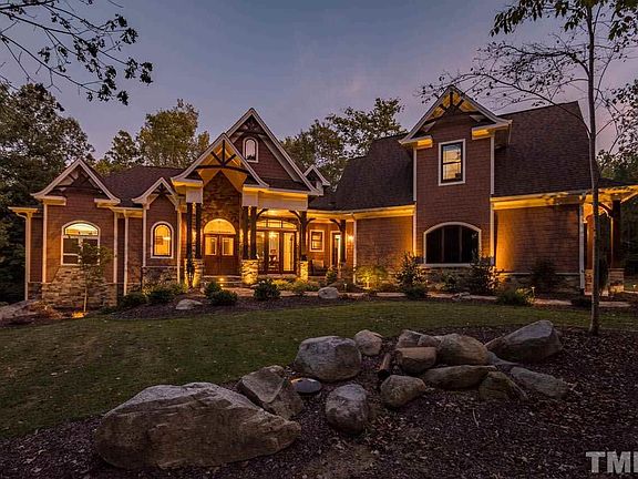 SEE VIDEO TOUR. Spectacular, custom built "mountain retreat" in Pittsboro! 4 BR/3.5 BA + bonus on 2.91 acre lot surrounded by trees! Stone accents, heavy wood trim, built-ins & 9" basebrds. FOUR fireplaces! Flr to ceiling windows in "Lodge room"! 1st flr "wood style" tile floors thru out. 1st fl master suite w/ luxury bath, FP & deck entrance. Gourmet kitch w/high-end, built-in Thermador appliances. Scr.porch w/fp & grill, house generator, Geo-thermal heating & cooling! Energy Efficient "Green" home