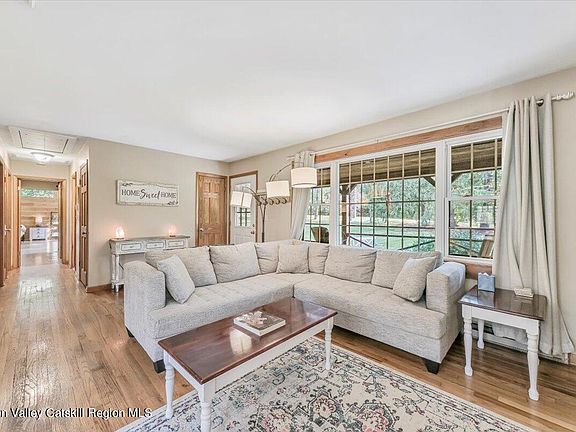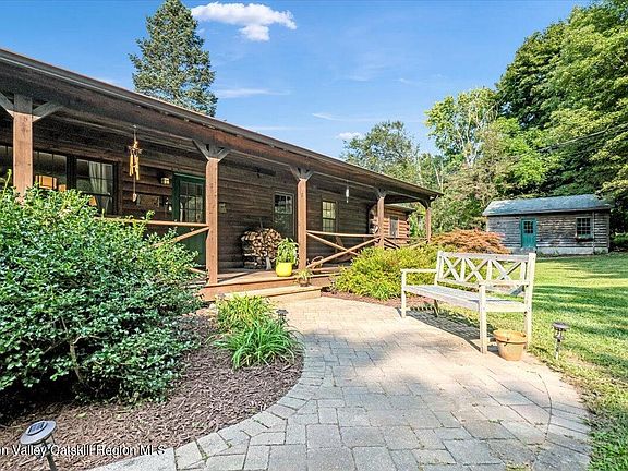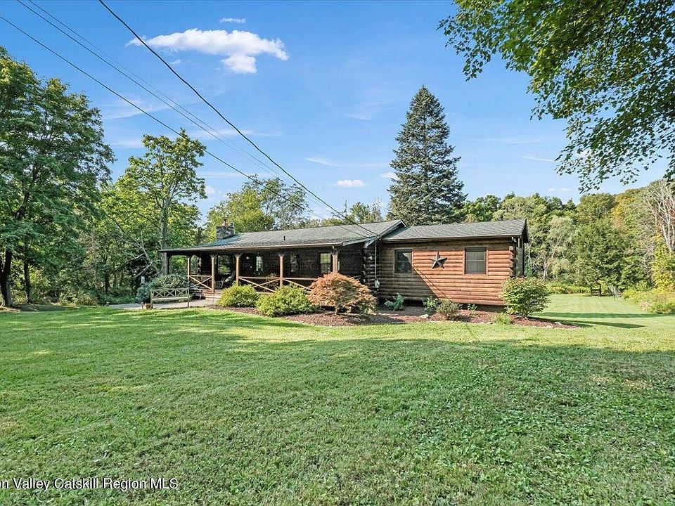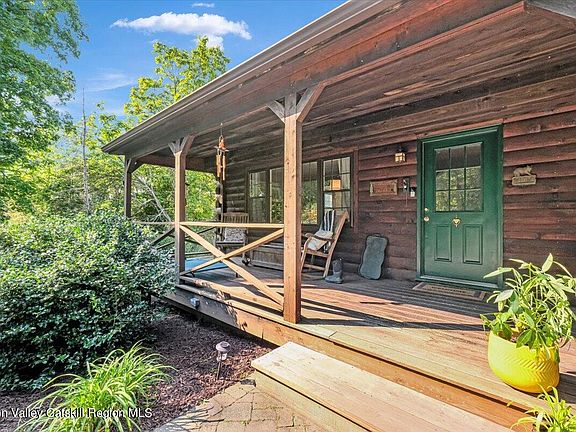 Nestled on 3 lovely acres between Millbrook and Rhinebeck, just a minute from the Taconic, this modern log home is a perfect blend of rustic charm and contemporary style. The moment you arrive, you're greeted by the expansive covered front porch a perfect spot to relax with morning coffee or work from home while enjoying the serene surroundings. Inside is a bright and inviting interior, where the recently renovated kitchen is the star of the show. It has vaulted ceilings, a skylight, new stainless-steel appliances, and an island. The kitchen seamlessly flows into the dining room and out to a large deck; a great layout for hosting gatherings, or enjoying dinner with a view of the lush property. A living room pellet stove invites you to cuddle up in winter and Central AC keeps you cool in summer. The first-floor primary bedroom has French doors that open to the deck. The vaulted ceilings, oversized walk-in closet, and en-suite bathroom make it feel like a sanctuary. Two more generously sized bedrooms and a lovely updated bathroom complete the main level. The lower level has a spacious family room with a wood-burning stove, an additional office or bedroom, plus a full bathroom and laundry room. Additional space on this level offers a separate entrance and tons of potential. A stream, large deck, and plenty of privacy feel like an escape from the world, yet you're close to the charm and convenience of nearby towns.