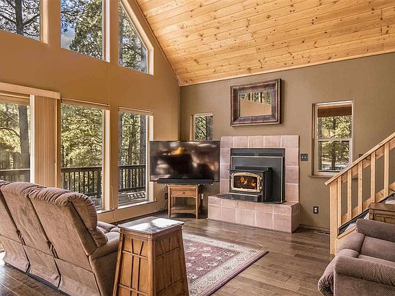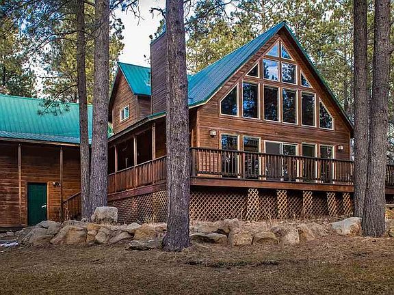 Beautiful Custom Built 3 bedroom/2 bath Home on 2 combined corner lots totaling 1.58 acres of Rocky Mountain real estate. Both of the intersecting streets are on the 2 tier list for early morning snow plowing. So this home has easy year round access into and out of the spacious circle drive. Open living room, kitchen and dining room backed soaring tongue and groove ceilings and a wall of windows to bring the outdoor in..This space flows out to the spacious wrap around deck which provides additional space for entertaining a crowd. The new hard wood floors, bathroom fixtures, kitchen sink/faucet and stainless steel appliances are beautiful. The master suite is spacious with room for a sitting area in addition to sleep. The private deck off the master is a great place to start the day with a cup of coffee! Large walk in closet in master. Office space in the loft is the perfect get away to work and enjoy the view of the pine trees. This home has a 506 sqft. finished, heated bonus space located above the garage..This would make the perfect spot for an artist studio, man cave, bunk room, or pool/game room..These sellers are full time residents and have raised their children in this beautiful home. All have enjoyed the large flat lot for playing and entertaining at the fire pit in the back yard as well as the convenient location. It is about 5 minutes to the ski slopes or Angel Fire Country Club, Fitness Center and Championship golf course. Heated green house with propane and water is a real perk. The Tuff Shed houses lots of equipment and toys. This home has been meticulously maintained through the years. Furnishings are included with this home. Computer, printer, and speakers also included. The Smith home is Nest Protected with smoke and carbon monoxide alarm that is monitored by the smart phone app. This home has fiber optic high speed internet.