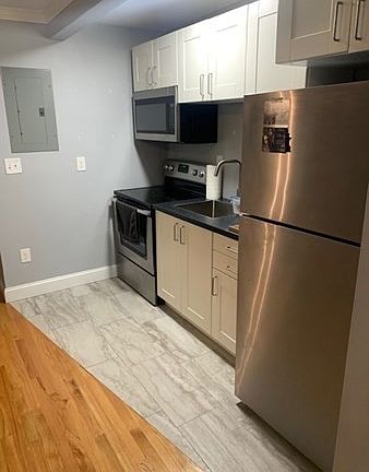 This renovated garden-level 1-bedroom, 1-bathroom unit offers 650 sq. ft. of modern living space with hardwood floors throughout. The updated kitchen features stainless steel appliances, a microwave, and new cabinetry, while the modern bathroom provides sleek finishes. Enjoy the convenience of laundry in the building and optional outdoor parking for rent at $250/month. Close to Boston Medical Center, Boston University Medical Campus, Tufts Medical Center, Harvard Medical School, public transportation, along with nearby restaurants, cafes, and shopping. Outdoor spaces like Jamaica Pond and Olmsted Park provide a great escape just moments away. NO PETS. BROKER FEE REQUIRED.