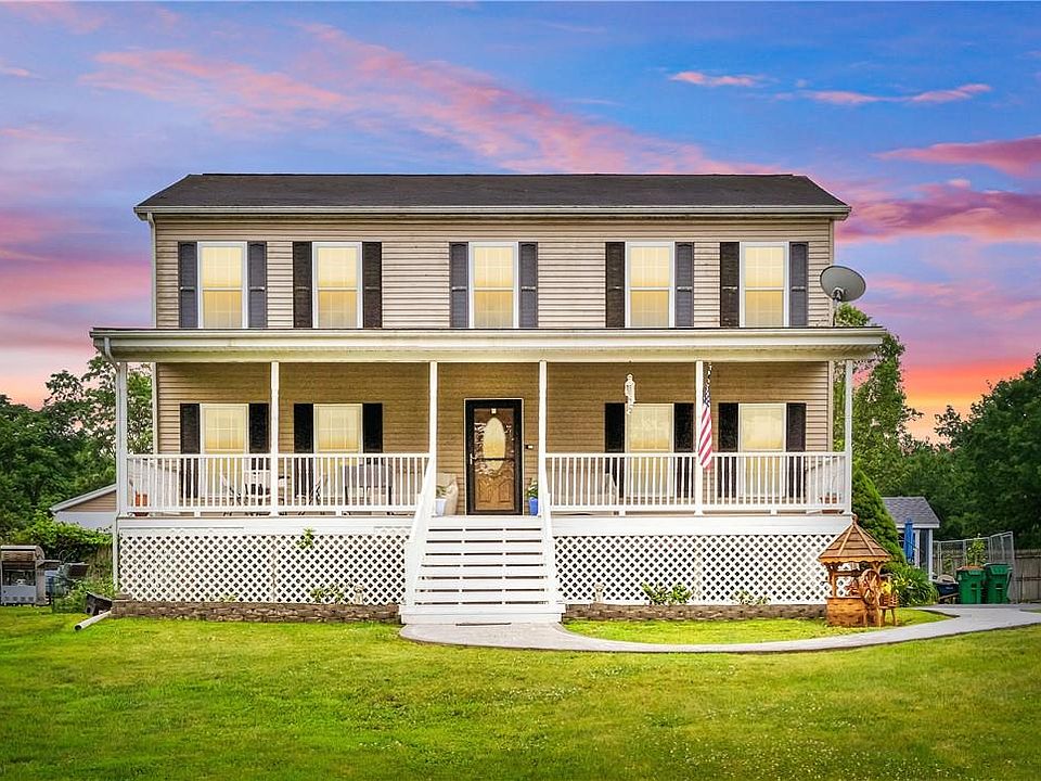 Gorgeous center hall colonial nestled in the Hyde Park school district. This charming 3 bedroom, 2.5 bath home embodies perfection. As you make your way down the stamped concrete walkway and onto the inviting rocking chair front porch, you'll find the perfect spot to unwind. Stepping inside, a granite-floored foyer welcomes you, leading to a double living room adorned with teakwood floors on the left, and a formal dining room on the right. The spacious eat-in kitchen and convenient half bath with laundry complete the main level. Upstairs, you'll discover an ample primary suite featuring a walk-in closet and a primary bath equipped with double sinks, a tub, and a separate shower. Additionally, there is a dedicated office space and two sizable bedrooms, accompanied by a full bath. The home has been equipped with a solar panel system, promoting energy efficiency and reducing electricity bills. Further adding to the appeal, the home offers a full basement and a generously sized stamped concrete patio, creating additional space for storage, recreation, and outdoor entertaining. This home is truly a gem, combining elegance, functionality, and eco-consciousness. Experience the joy of comfortable living in this delightful abode situated in the town of Poughkeepsie.