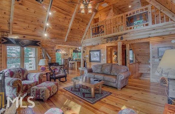 Fantastic opportunity to own a very private lake front cabin. As you come through the front door you are greeted with a massive stone fireplace, high vaulted ceilings with a few to the lake. Spacious kitchen with loads of counter space and cabinets, open to the dining area and great room. Private master on the main with french doors leading to an open deck with views of the lake. Upstairs there are an additonal 2 bedroom and bath. The terrace level with cozy stone fireplace and 2 additional bedroom. The property is very private with a gentle walk to the lake. Enjoy you time on the lake with your 2 boat slip party dock. Keep the cabin on the very successful rental program or enjoy it as a full time residence. Situated only a couple of miles from the Marina and downtown Blue Ridge. Don't miss this one. Offered partially furnished.