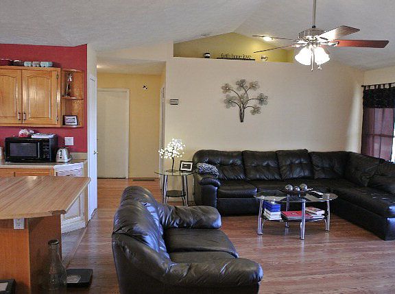 This is a great home just south of town with an open floor plan & vaulted ceilings. On the main level there's a split floor plan, an island in the kitchen, large laundry room convenient to the main living area, large tub, covered porch all across the upper level & much more. Downstairs is additional space perfect as rec room or man cave (pool table stays!) with 1/2 bath plus an open garage & workshop area. Home has two driveways for easy access to both the lower and main living areas. Very nice yard with fencing and pond with gentle slope for the kids and pets to play or for a garden.