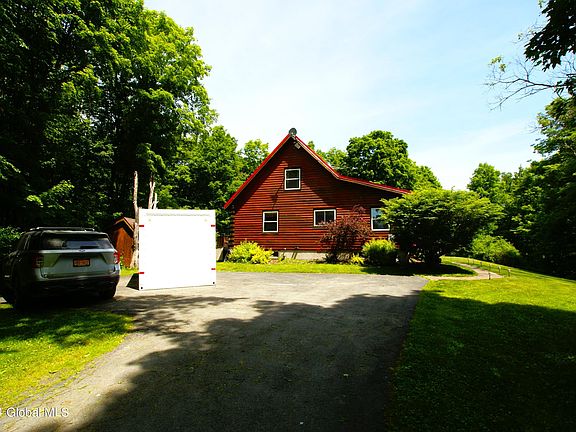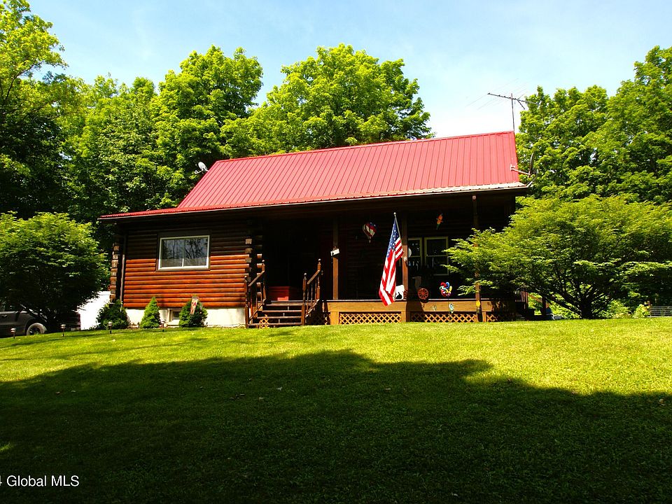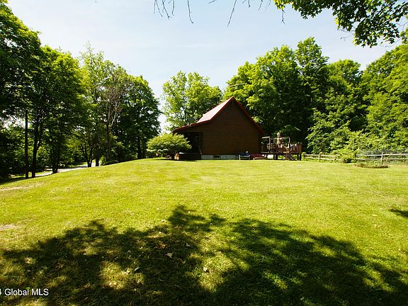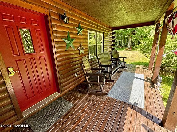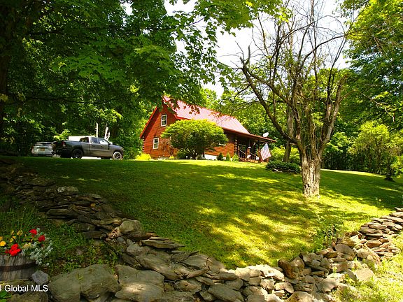 Picturesque knoll top Log home on 3 plus wooded acres that you will fall in love with! Featuring nice sized living room with open cathedral ceilings and slider to big deck, beautiful kitchen with dining area, two bedrooms and full bath with whirlpool tub downstairs and landing office area leading to big bedroom and 2nd bath upstairs. Full basement with utility and laundry combo, storage room and good size finished family room, Enjoy the quiet on your front sitting porch overlooking it all, mature landscaping, gardens, room to run yard, century old stone walls, paved drive, two storage sheds, hiking atv trail, generator with disconnect switch hookup, newer windows & furnace. Mins to Vermont lake George and Saratoga!