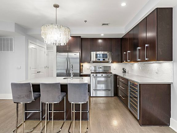 The chef’s kitchen is a showstopper—equipped with a center island, sleek dark mocha cabinetry, quartz countertops, stainless steel appliances including a five-burner professional gas range, a temperature-controlled wine fridge, tile and glass backsplash, and under-cabinet lighting. Whether you're hosting guests or enjoying a quiet night in, this layout offers generous space and exceptional storage to suit any lifestyle.