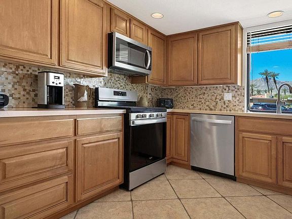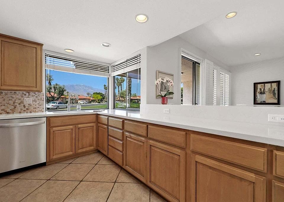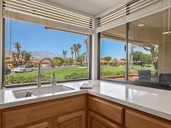 Stunning Golf Course & Mountain View Home: Thoughtfully Updated & Move-In Ready! Welcome to this beautifully upgraded, open-concept home ideally located with breathtaking golf course and mountain views. From the moment you walk in, you'll appreciate the attention to detail and quality finishes throughout.The remodeled kitchen is a chef's dream, featuring quartz countertops, a charming farmhouse sink, modernized cabinet and drawer faces, stylish backsplash, and stainless steel Whirlpool appliances. Enjoy morning coffee in the cozy breakfast bar, offering picturesque corner-window views.The spacious living and dining areas seamlessly flow together, perfect for entertaining or relaxing, all while taking in the scenic backdrop. A skylight brightens the updated den, making it the perfect space for a home office or reading retreat.The guest bathroom is tastefully refreshed with matching cabinetry, a sleek single vanity, and a tiled tub/shower combo with floor-to-ceiling tile. The guest bedroom offers comfort and style with an upgraded closet featuring built-in drawers.Retreat to the primary suite, where an updated walk-in closet with custom built-ins is a dream for any shoe collector. The luxurious en-suite bath includes a large step-in shower with elegant floor-to-ceiling tile, expansive dual vanity, and ample storage.Additional highlights include: handicap-accessible bathrooms, dual-pane windows and plantation shutters, tile flooring with carpeted bedrooms, plus baseboards for finished look, recessed, dimmable lighting, spacious laundry room with abundant storage, garage with custom built-in cabinetry, beautiful stone tile patio with retractable awning for year-round enjoyment.Sunrise Country Club offers secure, guard-gated living with 746 residential condos, an 18-hole Par 64 golf course, nine championship tennis courts, ten pickleball courts, twenty-one pools and spas, plus a clubhouse featuring a dining room, lounge, grille, pro shops, and a fitness/activity center. Two new bocce ball courts add to the recreational options. Located in Rancho Mirage--the heart of the desert--the community is close to top shopping, entertainment, and health facilities. Palm Springs International Airport is only 20 minutes away.This home offers not just comfort and functionality, but also a prime location and unbeatable views. A true gem--don't miss your chance to make it yours!