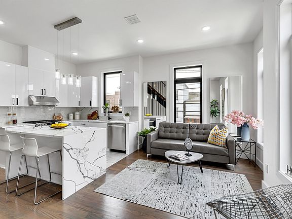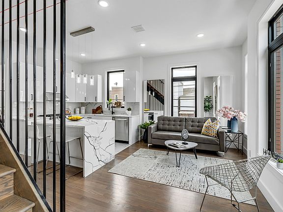 Brand New Unique Triplex Condo Townhouse, located in the heart of the highly desirable Jersey City Heights! Featuring 3 bedrooms, 3.5 baths, corner unit with an abundance of large windows drenched in natural sun light. Main living area with custom design metal railing, high ceilings with LED strip lighting make for a luxurious modern feel, sliding glass doors leading to balcony, contemporary fully equipped kitchen, with stainless steel appliances, high gloss white cabinetry, white quartz countertops and waterfall center island for additional storage, 3rd bedroom with a beautiful modern full bath and stand-up shower completes the floor. Lower-level flex room with private entrance, built-in wet bar, half bath perfect for family/living or home office, top floors main bedroom with a private balcony, wall to wall closet, generous 2nd bedroom, and 2 full baths, one with a tub and the other with a stand-up shower, bonus home office area. Hardwood floors, central A/C, washer and dryer room, private rooftop deck with adjacent wet bar and breathtaking views. 1 private parking garage (not tandem), exclusive use of the front yard, and plenty of storage! All major transportation at your fingertips, Close to all conveniences, parks, schools, library, restaurants, and more! Unpack and move in! Property is eligible for a 5 year tax abatement!