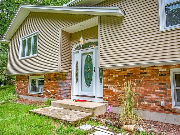 This split-entry raised ranch, in excellent condition, boasts a two-car garage and sits prominently elevated from the street, offering a serene and nature-surrounded environment. The open floor plan features three bedrooms, two bathrooms, new flooring, an expansive family and dining room, and a kitchen equipped with a stainless steel range/oven and refrigerator. Natural light abounds through the kitchen skylight and the glass sliding doors in the family and dining room. The lower level includes a spacious second family room with a custom stone wall and fireplace, a versatile bonus room with a closet ideal for an office, bedroom, or workout space, and a large laundry room with an additional half bath and ample storage. Direct home access is provided through the spacious two-car garage. The home is equipped with a NEST thermostat and an integrated alarm system. The 1.39-acre lot features a fenced section, fire pit area, shed, and plenty of open space.