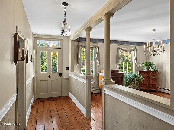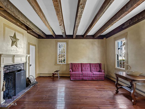 Once in a while a property presents itself that is steeped in history, original details & lovely grounds. This 1800's farmhouse offers wide-plank yellow pine flooring throughout, original interior doors/hardware, beamed ceilings & more. You have a combination of old & new here w/plenty of potential w/unutilized spaces. The 1st floor offers living room w/fireplace, expansive dining room, family room w/gas stove & kitchen w/cherry cabinets & bay window overlooking grounds & pool. The 2nd floor has primary bedroom suite w/spacious primary bath; 3 bedrooms w/views of grounds, pond & hills beyond, plus full bath & laundry. The attached 2-car garage & large barn have room for all your toys. The lot has a large pond, perennials, inground pool, decking. A vintage oasis awaits you!