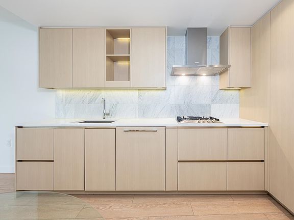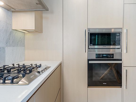 Floor-to-ceiling windowsSleek open-plan kitchenStainless appliances