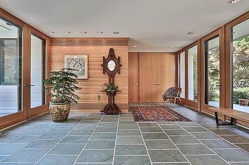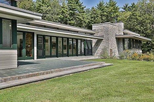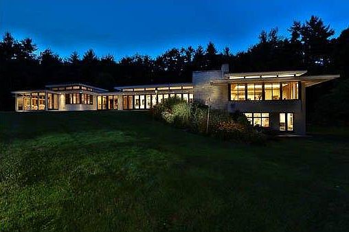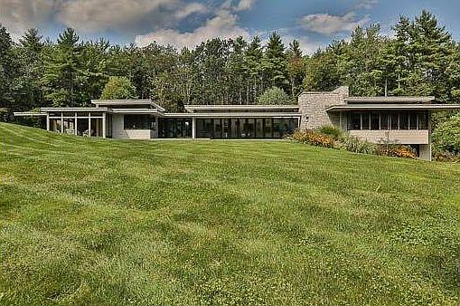 Don't miss the opportunity to own this magnificent modern home located on 15 private acres. The construction materials have been brought in from across the country and around the world! The grand foyer leads you into an art gallery that is one of a kind. Every room is enclosed by expansive walls of glass bringing the outdoors into the home. Spacious custom kitchen with breakfast nook & attached screen porch provides for ideal summer dining and relaxation. Formal dining room with built-in lighted cabinetry. Living room with brass surround fireplace has slate surface bookshelves below the window walls, indirect lighting and hardwood floors. The 1st floor master bedroom has a walk-in closet, over sized bath with walk-in shower and a separate tub. Private office accommodates any type of business or activity. In addition, there are 3 bedrooms, 2 baths and a family room with French doors opening onto the manicured lawn and gardens. This unique property in South Hollis is truly a rare find.Various photos by Peter Vanderwarker used with permission.