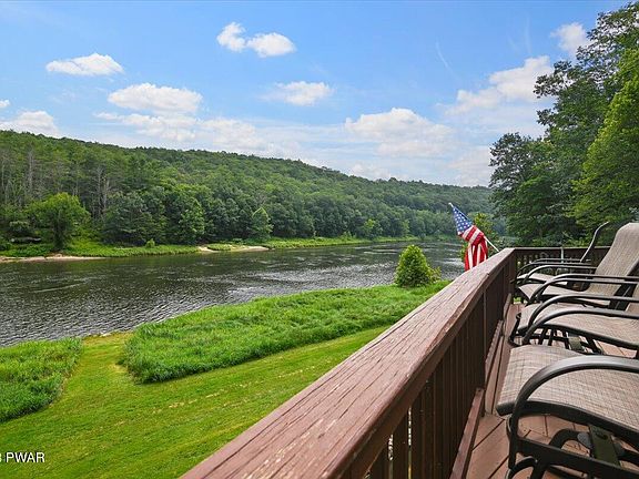 IMMACULATE DELAWARE RIVERFRONT CEDAR CHALET HOME WITH UNPARALLED VIEWS OF SKINNER'S FALLS! This impressive custom home has floor to ceiling windows framing river views from all 3 levels! Expansive front porch lets you enjoy the amazing sights and sounds of the river! Primary bed & bath on the first level, with large living room/kitchen area and large screened side porch for entertaining & bald eagle sightings! An upstairs loft is a haven for relaxation & soaking in mesmerizing views. Lower level offers 2 bedrooms, a full bath & additional living area with kitchen. Walk out access to the covered patio area creates a perfect entertaining space which leads to 100+ feet of easy level access to enjoy relaxing, fishing, sightseeing, boating & swimming on the wild and scenic Delaware River!