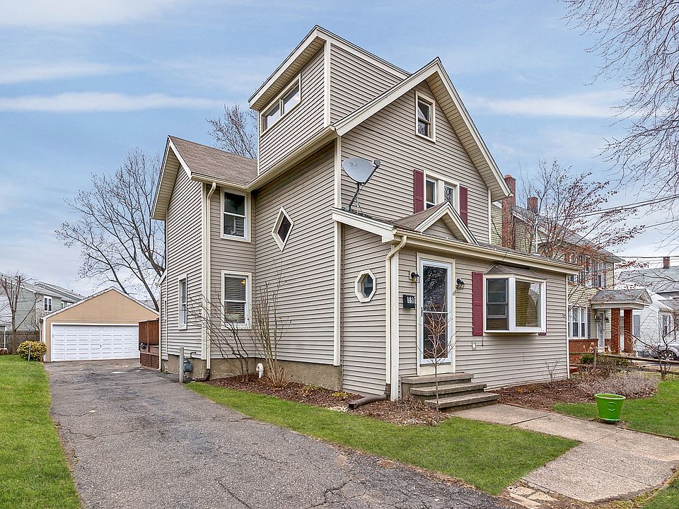 This charming Colonial was renovated in 2013 with a new kitchen, bath and flooring throughout the first floor. Front sun room is perfect for an office or study. Third bedroom is on the third floor with an additional 500 sq ft of space. Back yard is fenced and has a deck for entertaining and a two car detached garage.