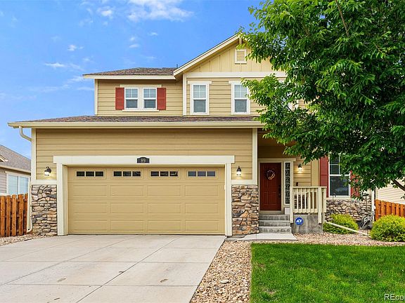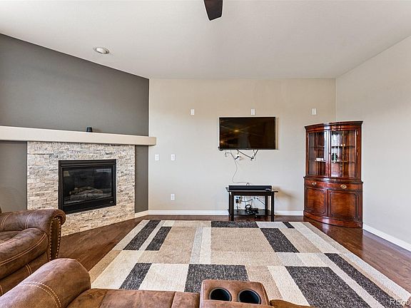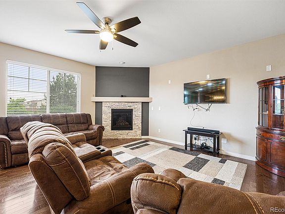 Stunning, former model home with luxurious upgrades and mountain views. Inside, the bright and open floor plan features wide-plank, hardwood flooring throughout the first level, a cozy gas fireplace with stone tile surround, and a dedicated study/office on the main. For the chef, the kitchen offers 42-inch cabinets in a rich wood tone, slab granite counters, stainless appliances, and a large center island that's purely for prep or enjoying a casual meal. Upstairs, you'll find a spacious primary suite with five-piece bath, including a dual-sink vanity, plus a grand walk-in closet. Three more bedrooms can be found on this level, one with its own ensuite bath and two more sharing a Jack-and-Jill bathroom. This home also includes a full, unfinished basement with rough-in plumbing, so you can add more space and value to your investment. Fabulous location close to the community pool, clubhouse, school, C470, Buckley AFB, and Anschutz Medical Campus! Come take a look and fall in love.
