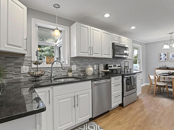 Here's your chance to purchase a completely renovated, Ranch-style home. You'll love preparing meals in your eat-in kitchen, complete with grey laminate flooring, granite counter tops, white cabinets, tile back-splash, recessed lighting, and stainless steel appliances! After dinner, relax in your nicely sized living room, that features wood flooring and a bay window. This home boasts three bedrooms, all with wood flooring and decently sized closets. The bathroom has grey laminate flooring, a tub / shower combo, and an updated vanity! Head downstairs to find your partially finished basement, with recessed lighting. Enjoy crisp Fall nights in your fenced-in yard, featuring your patio and hot tub! Parking is no issue with your two-car garage, connected to the breezeway. This home also features new electrical, plumbing, roofing, central AC, furnace, hot water tank, and gas heat! Don't miss out on this beautifully updated home.