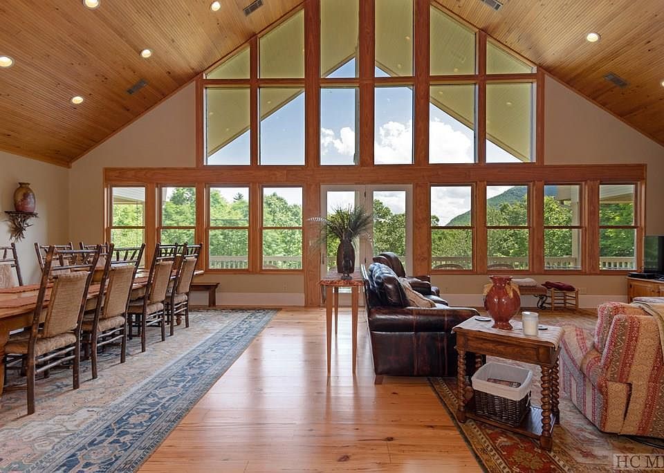 This spacious home on over six acres is located just minutes from Cashiers and offers beautiful southern mountain views. Soak in the tranquility of the mountains while sitting on the wraparound porch, or take advantage of the central location and enjoy the area's renowned dining, shopping, and golf, all just minutes away. The expansive great room is part of an open floor plan that offers plenty of room for entertaining large groups with a large dining area, hardwood floors, and a dramatic floor-to-ceiling fireplace. A wall of windows floods the entire space with natural light. Enjoy the stunning view as you cook in the gourmet kitchen equipped with premium stainless steel appliances and fine custom cabinetry. There are multiple bedrooms on the main level, as well as additional bedrooms on both the lower and upper level. The family room on the lower level features a fireplace and its own complete kitchen and dining area, providing guests with privacy and comfort.