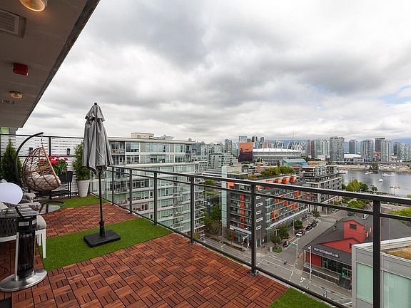 PENTHOUSE on top of Olympic Village and centre stage to panoramic views of the downtown skyline, false creek, and north shore mountains. With 1562 square feet of living space this unit is fully renovated. Features a gourmet kitchen and open living & dining with unobstructed views. On one side the unit is the master bedroom with an incredible ensuite bathroom and walk-in closet and on the other side a den and two generous bedrooms with two tastefully renovated bathrooms. The over 750 sq ft of private outdoor space is finished unlike any other unit and provides a sky backyard (rooftop) with a view. Comes w two parking+ two storage lockers making this green living building an ideal space for the professional family.