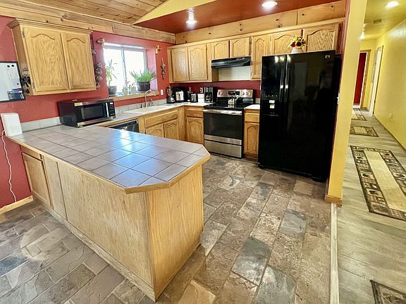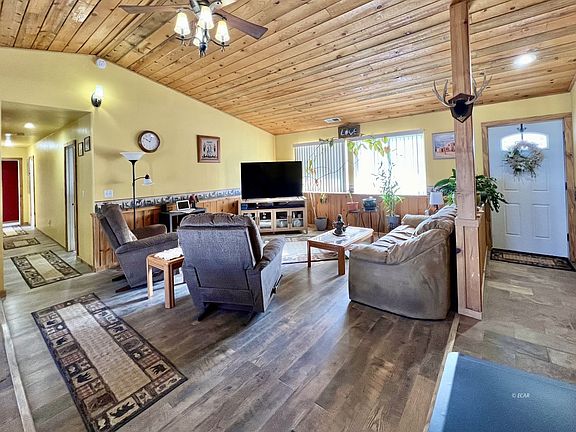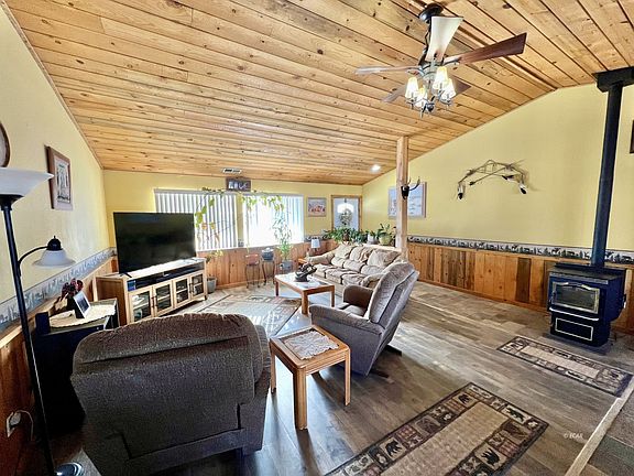 This charming home offers 3 beds, 2 baths, and a versatile office space perfect for remote work or study. Step inside to discover beautiful tile countertops and flooring in the kitchen and bathrooms, featuring double sinks in both the master and second bath. The heart of this home is the expansive open living area, seamlessly connecting the living room, dining room, and kitchen. The vaulted tongue and groove ceiling adds an element of elegance, while the hardwood flooring and pellet stove enhances the warm ambiance. The kitchen is equipped with tile countertops, a breakfast bar, an electric range, dishwasher, and refrigerator, perfect for entertaining. The large laundry room doubles as a utility room. The three bedrooms and office are adorned with carpet flooring. The master bedroom has two closets and a sliding door that opens onto the beautiful outdoors. The backyard has a covered patio. Situated on an acre of land, this property comes complete with a septic dump for RVs and a 30 amp RV hookup! Two sheds provide ample storage, and the property is fully fenced, perfect for your furry friends. Don't miss the opportunity to make this wonderful home yours!