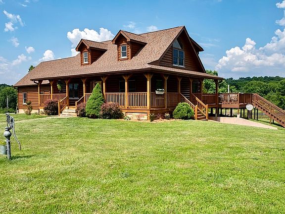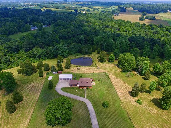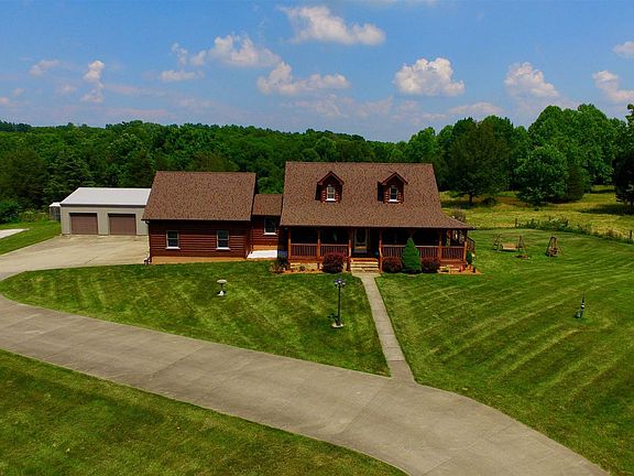 Located just outside the city limits with no restrictions. 27.57 ACRES! Beautiful-updated 3 Bedroom over 3000 sf Log Home with wrap-around porch, back deck, hot tub, & screened-in porch. The property is completely fenced, partially wooded with pasture, 2 ponds & creek. Large pond is stocked with fish. 30x50 (3) Bay Garage w/ heat/air, foam insulation,10k lb. car lift, air compressor. 24x56 Pole Barn. Step inside the home and be WOWED! Cathedral ceilings with wood beams, and open layout. The Kitchen was designed with a chef in mind, top of the line appliances, custom cabinets & granite countertops. Master Suite is located on the upper level w/ a loft that can be used as a sitting rm./office. The Basement has a wet bar/kitchenette, 1/2 bath & a great space for recreation/theatre. Roof is 1 yr old. HVAC /humidifier is brand new. Wood Boiler is a backup for house/garage & will radiate heat through floors. Propane gas is used for back-up. Energy Efficient! Home Warranty included thru Dec. 23, 2020.