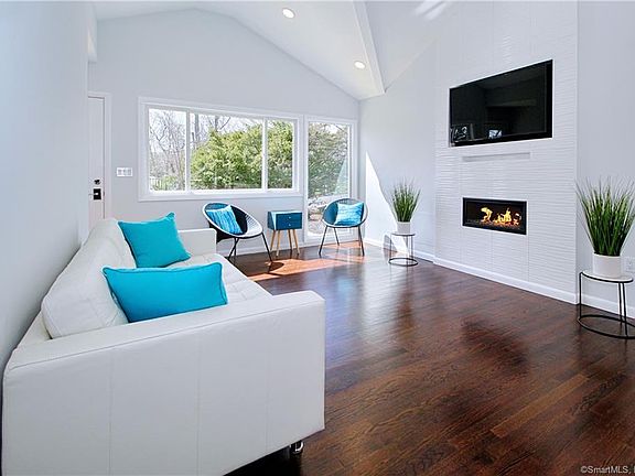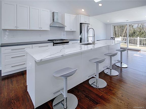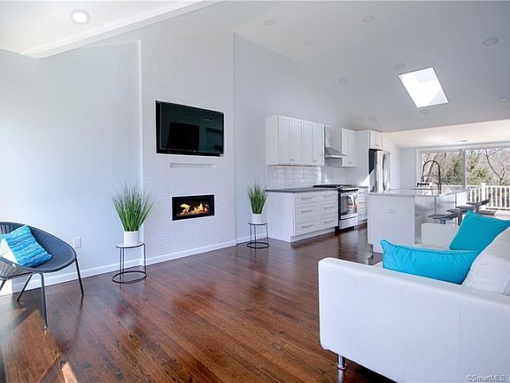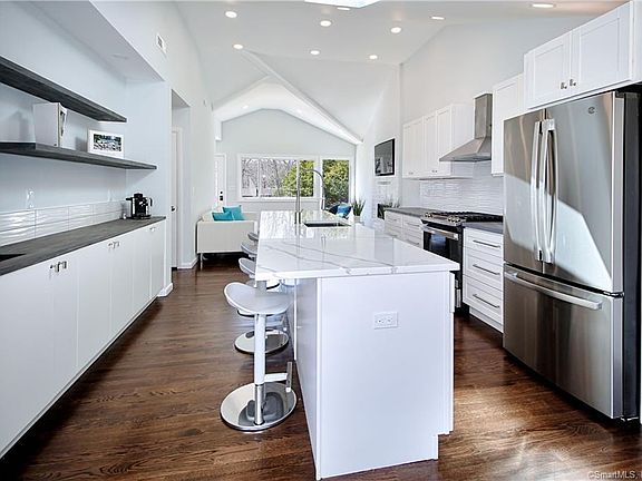 Beautifully designed and spacious home has a mid century vibe.The home has an open floor plan concept with vaulted ceilings ,an abundance of over sized windows (sun drenched rooms) and highley stylized features. The home was originally built in 1958 but has been extensively rebuilt with new electric ,plumbing, C/A,furnace, gas, floors,windows ,siding on 3 sides, insulation, sheetrock, freshly painted inside and out ,fixtures as well as all bathrooms (3) , gourmet kitchen , decks and a new driveway. As good as new with high quality finishes , not your typical redo. The walkout lower level is finished with a large family room ,wet bar, refrigerator, full bath ,laundry and a bedroom or office with a private entrance. Minutes from 2 golf courses, the Merrit Parkway and 10 minutes to town and train. Another creation by VG Design Partners elevated to it's Signature Home Collection Series.