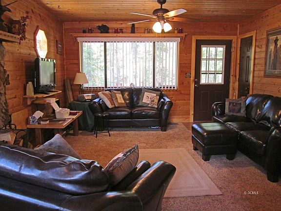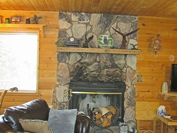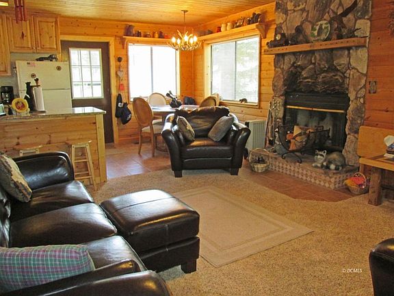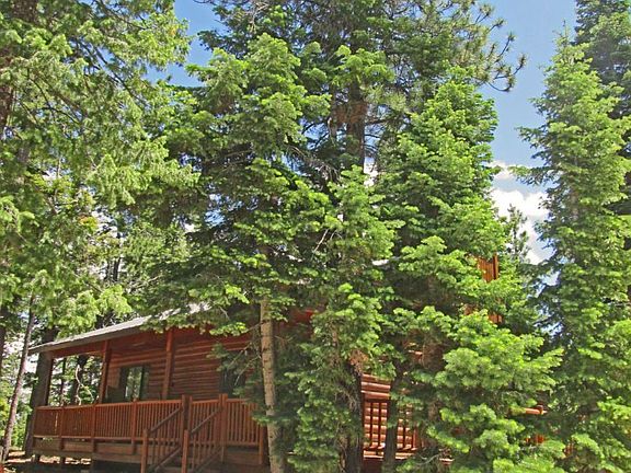This one story cabin all main floor living is located on .50 acre lot nestled in the trees. It has covered and uncovered decks on 3 sides of the cabin for great outdoor enjoyment in any weather. Open living, dining and kitchen floor plan featuring a lovely wood burning fire place. Master bedroom is spacious and has walk in closet. The second bedroom for guests or a lovely den. Also a full bathroom and separate laundry room with propane furnace. Lots of wood features offer that cozy cabin feeling. The outside is beautifully tree, has a fire pit, horseshoe pit and a detached 280 sq ft garage for all your mountain toys. This is one sweet place!