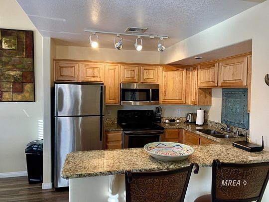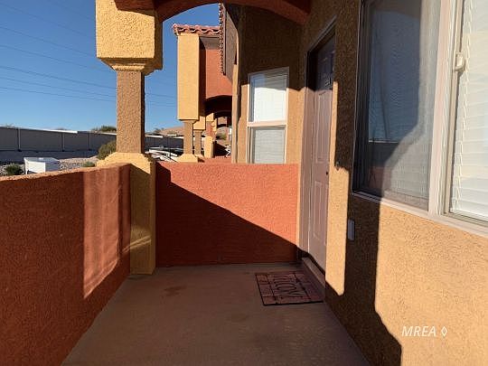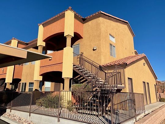 This Hawk Ridge condo has beautiful views of the Virgin mountains and Flat Top Mesa. This condo is located in a well maintained community, offering ample guest parking within steps and is in a desirable private location. This TURN KEY, FULLY FURNISHED AND ACCESSORIZED condo features costly granite counter tops, beautiful raised panel cabinetry and stainless steel appliances. Attractive plank flooring runs through the entry, kitchen, breakfast nook and bathrooms. The open and lofty space allows for plenty of natural light and the master ensuite is completely private located on the second level loft. It's a rare find to have 3 spacious bedrooms and/or den in an easily maintained condo unit. The home offers plenty of storage space inside and a good size storage room outside. Enjoy Mesquite's awesome weather and a gorgeous view from the covered front patio. The community swimming pool, spa, clubhouse and fitness room are within close proximity and the HOA fees are all inclusive. This condo provides the perfect getaway. All you need are your clothes. This condo is permitted to be put into the short term rental pool.
