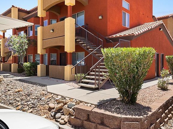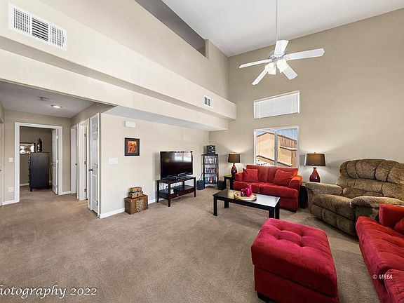 This condo is located in a well maintained community, offering ample guest parking within steps and is in a desirable private location. This TURN KEY, FULLY FURNISHED AND ACCESSORIZED condo features costly granite counter tops, beautiful raised panel cabinetry, appreciated bay window in dining area and a spacious vaulted great room. Attractive tile runs through the entry, kitchen, breakfast nook and bathrooms. The open and lofty space allows for plenty of natural light and the master ensuite is completely private located on the second level loft. It's a rare find to have 3 spacious bedrooms and/or den in an easily maintained condo unit. The home offers plenty of storage space inside and a good size storage room outside. Enjoy Mesquite's awesome weather and a gorgeous view from the north facing covered front patio. The community swimming pool, spa, clubhouse and fitness room are within close proximity and the HOA fees are all inclusive. This condo provides the perfect getaway and includes some RV parking. Permitted for short term vacation rentals, this condo makes for a great investment opportunity.
