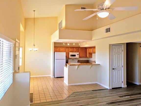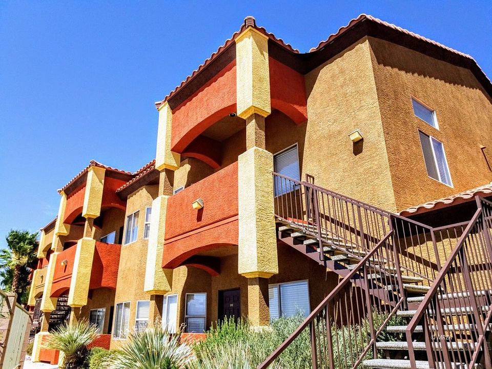 Best location in Hawk Ridge with Incredible Views! Out one side, view over park, valley and town with beautiful mountain and golf course views. Out the bedrooms, look down and check out if the pool area is all yours! 3 Bedroom, 2 bath. 2nd level entry in 3 story building. First floor 2 bedrooms and one bath, second story loft style master. Granite counters and glass top stove in kitchen. New kitchen faucet & new bathroom shower heads. All appliances included. One reserved carport space super close. Lots of extra open parking, RV Parking, Xtra storage rm. HOA allows vacation rentals, so incredible opportunity for a part time owner investor. Vacation Rental okay with city business permit. New vinyl plank flooring downstairs, all new windows on POOL (East) side. Other new windows on West side. New plantation shutters for privacy in Master suite loft over living room. Walking distance to Wolf Creek golf course and Oasis Club with Palmer & Canyons courses. Walking distance to casinos & park. The amenities are awesome! Pool with waterfall, spa, gym, party room with full kitchen & rv parking! HOA also includes all exterior maintenance, insurance, cable tv, trash, sewer, water, and more!
