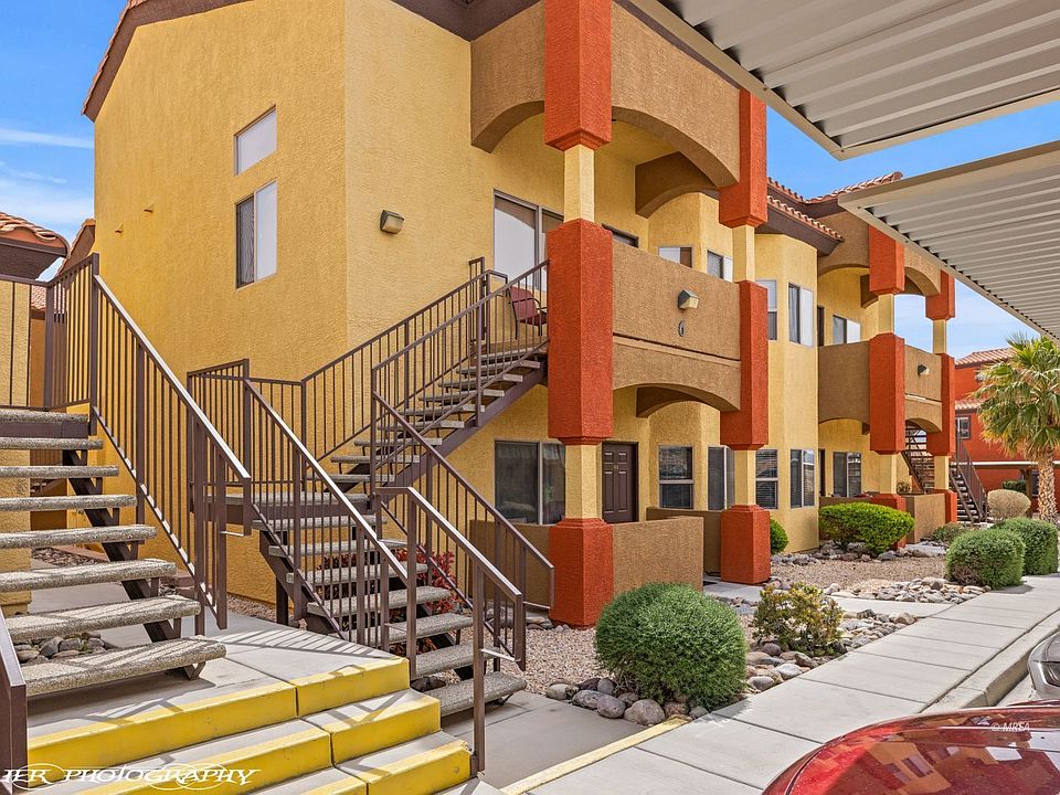 Beautiful Desert Retreat! The high ceiling and natural light create a bright and airy living area. The open floor plan is perfect for serving up delicious meals prepared in the lovely kitchen. Plant shelves await your personal touch, while neutral colored flooring and paint are the perfect canvas for any style of decor. This three bedroom has two full bathrooms. Large closets provide lots of storage space. Each bathroom has a gorgeous framed mirror and dark barn door cabinets. The community clubhouse has an amazing pool for you to enjoy. Take in the desert views from the balcony at the front entrance: the perfect space to sip a morning coffee or enjoy the cooling temperatures as the sun goes down. This condo comes "Turn Key" and vacation rentals are allowed.
