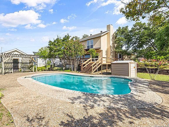 Recent price reduction! Nestled on an oversized lot in beautiful Cypress Cove, this Hill Country home offers both seclusion and timeless charm! The expansive property provides ample space for added possibilities - whether it may be building a workshop, adding a carport, or extending the existing fence. With striking views and an inviting inground swimming pool this property truly delivers an irresistible Hill Country retreat. This home's effective age has been dramatically reduced thanks to recent renovations and improvements! Two spacious living areas are featured, one with elegant Saltillo tile flooring and a classic wood-burning fireplace as the focal point, while the other offers wood-look LVP flooring and warm inviting space for cozy gatherings. The kitchen is full of character with classic subway backsplash tile, a walk-in pantry and views of the peaceful Texas hill country! Updated stainless appliances and a peninsula countertop doubles as a breakfast bar. The kitchen is central to both dining spaces, one being more formal and one for more casual gatherings or morning coffee. Added storage space below the stair well can potentially double as a children's play area. All bedrooms are privately located upstairs, offering a quiet separation from the main living areas. Each bedroom includes a generously sized walk-in closet. The primary suite offers the most stunning panoramic hill country views - a daily reminder of the natural beauty surrounding this property! Seller is offering a complete 13 mo. home warranty package with full coverage with the Diamond Plan through Home Warranty of America, a $700 value!! Full stucco exterior walls provide both structural integrity as well as timeless curb appeal. Out the back door you will find a large covered deck with plenty of space for family gatherings, your own hidden resort! A dedicated pool pump house is tucked out of site along with a storage shed, and the small air-conditioned outbuilding is perfect for a workshop, home studio, gym or flex space to suit your needs. Upgraded plumbing fixtures included are soft close toilets and a water softener system, ideal for protecting your plumbing and extending the life of your appliances. Additionally a professionally installed security system has been provided for elevated safety and comfort. The neighborhood provides access to the Guadalupe River, feeding Canyon Lake. Amenities included a swimming pool, tennis courts, park and play area, fishing pond and more! Short and long-term rentals are allowed. Centrally located to San Antonio, Boerne, Blanco, San Marcos, Gruene, or New Braunfels. No city tax! Canyon Lake is just minutes away, awaiting your fun family excursions! So whether you're watching the stars from your patio or soaking up the morning light from the upstairs windows, this home is designed to slow down time and let you live fully in the moment! A true private oasis! So get ready to fall in love with your very own slice of the Texas hill country!
