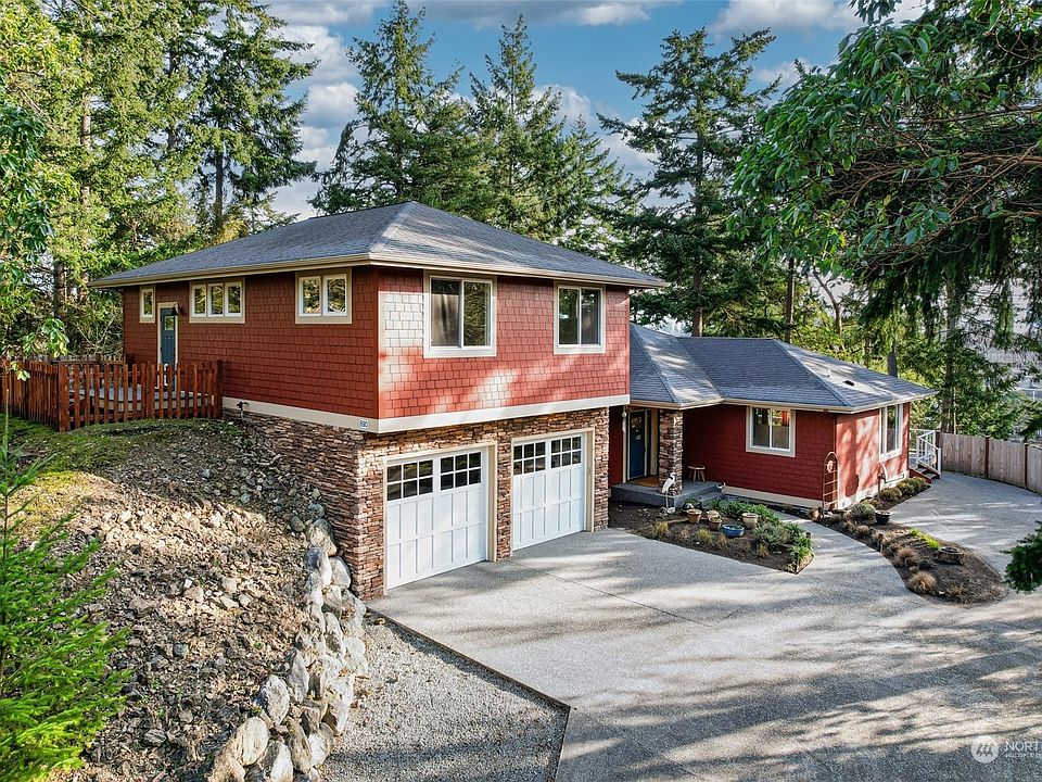 Perched above the quaint fishing village of La Conner, watch the eagles soar as you take in magnificent views of Mt Baker, Rainbow Bridge & Swinomish Channel. Very private & meticulously maintained home tucked in the trees w/picture windows & large deck for entertaining. Open concept living, dining & kitchen. Take in the views from the main level primary bdrm with walk-in closet, en-suite w/soaking tub, travertine shower & flooring. Add'l half bath on the main. Gorgeous hardwood throughout the main floor. Upstairs is set up as a MIL w/ separate entry/access from the main. 2 bdrms, full bath, 2nd kitchen, great room & private deck on the backside. Don’t miss the garden! Hardi shingles, large 2 car garage, high efficiency heating & A/C.