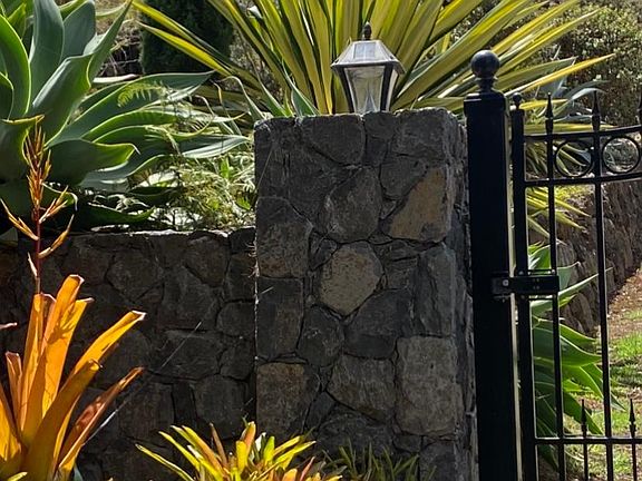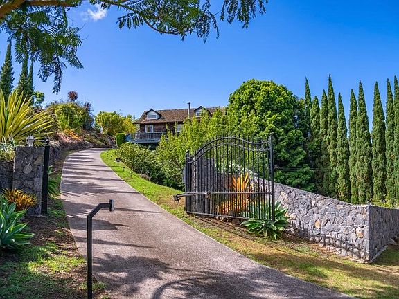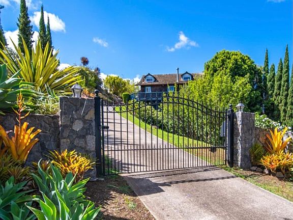 Enchanted gated oasis in upper Kula, Maui with exquisite manicured half-acre of land, majestic mountain (volcano) views, distant ocean views, fantastic succulent gardens, fruit orchard, vegetable gardens, meditation garden, petite koi-lily pond, and terraced spaces. Harvest peaches, cherries, avocados, citrus, and gather fragrant produce from the veggie and herb gardens. Listen to morning birdsong while nibbling freshly baked La Provence croissants at the sunny bistro table in your complimentary spa robe, then relish soothing quiet throughout the day while reading in the macrame' hammock or contemplating in the meditation garden. Work from Home at the sunny dedicated workspace overlooking the colorful succulent garden, or head out for a day at the beach. Enjoy early evenings playing bocce on the expansive lawn while you grill on the gas BBQ, followed by stargazing under the dark and dazzling skies. Inside the open floor plan, soaring custom crafted ceilings, sparkling stained glass and plank floors are reflected in the vintage mid-century windows, filling your living space with natural light and incomparably lush Kula views. The home includes a loft, plus 2 bedrooms combined into a Master Suite with media alcove, Practice Aloha cooking in the spacious well equipped kitchen, and hosting intimate dinner parties in the dining room designed with seagrass chairs and white stoneware. You'll relax next to the fireplace on deep soft seating, textured throws and custom rugs and lighting. Experience dramatic sunsets from the rustic Adirondack chairs gracing the upper deck as you see the twinkling lights of Wailuku below, and astonishing island night skies above. Finish the evening dreaming of your next excursion...sparkling beaches, snorkeling, whale watching, golf, shopping, dining, touring, hiking...it's all here on Maui. Enjoy a movie in the media alcove in the beautiful Master Suite before you slip under the cozy down comforter and crisp new sheets. You can even camp out under thousands of stars on your private enclosed lawn as the moon rises over Haleakala volcano, and your perfect Maui day whispers goodnight... A uniquely beautiful private mini-estate, thoughtfully furnished throughout with all curated pieces, rugs and accessories, including bedding, dishes and glassware, cooking utensils, kitchen accessories, cutlery, barware and bakeware, linens, towels and complimentary robes. Beach chairs, boogie boards, sleeping bags, pup tent, cooler and backpack also included for your use. A perfect nest for new arrivals to the island, remote workers who want to try Maui life, those exploring a new chapter or transition, or anyone looking to get away from it all and enjoy the peaceful pace and organic sanctuary of upcountry life in Kula, Hawaii. Just Minutes from fun historic Makawao Town and Olinda hiking, with scenic access to restaurants, shopping, dining and beaches in Pa'ia, as well as the beaches, kite surfing and drama of the North Shore...or a Oceanside drive to miles of white sand, shopping, dining and entertainment in Lahaina and Ka'anapali. 6 month minimum rental required. Mahalo! 2 bedrooms combined into Master Suite with Media Room, second sleeping space is loft with new carpet; new flooring installed throughout in 2022. Fully furnished. Tenant pays utilities. 4% Hawai'i GET tax will be added to base rent. Professional semi-annual grounds maintenance included; daily maintenance and watering is tenant's responsibility . May consider a small dog depending on age and breed with additional pet rent and additional deposit.