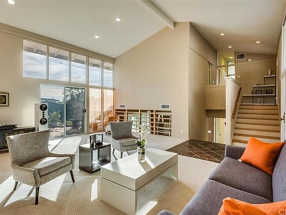 Designed by renowned architects Buff, Straub and Hensman and built in 1959, this tri-level midcentury modern home features three bedrooms and two and one half bathrooms in 2,129 square feet of living area. The dramatic approach to the front entry is through a lushly landscaped covered walkway with waterfall and koi pond, one of the many attributes of a thoughtfully designed 11,960 square foot lot. Inside, one enters into a striking living room with soaring open beam ceiling, walls of glass, and large fireplace. The backyard features a flagstone patio, great for entertaining or relaxing, complete with rebuilt patio cover and adjacent lawn area. This spacious property is located in the desirable community of Bellehurst View Estates, adjacent to Los Coyotes Country Club and close to good schools, shopping and restaurants.