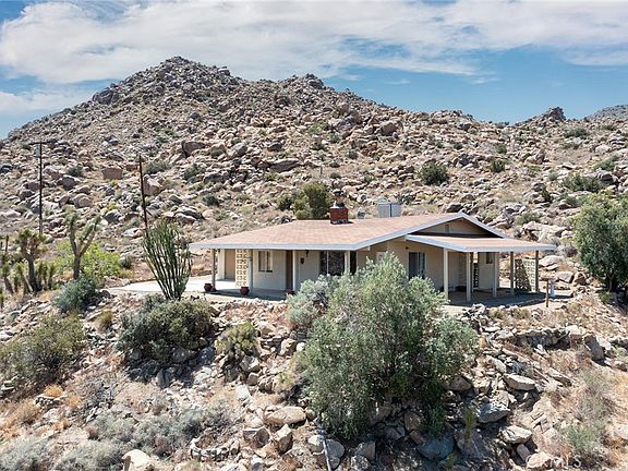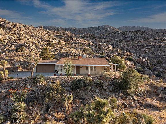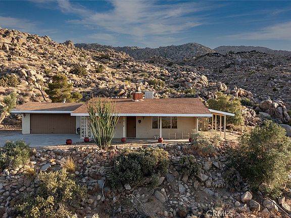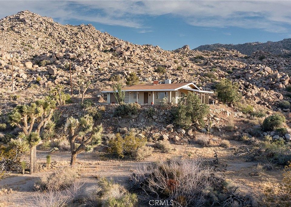 BOULDERS & JOSHUA TREES: Majestic private setting on rocky hillside with paved road access minutes to downtown. Walk out the backdoor, up your own boulder hillside and into a nature preserve connected to Joshua Tree National Park. Avoid the crowds – leave your car in the garage – while hiking from home! Over 20-acres, already split in two separate parcels: 15+ acres on which the house resides & 4.5-acre vacant parcel to develop or keep as a privacy buffer. One can build a primary home and guesthouse on each parcel – therefore you can still add a guesthouse to the 15-acre parcel and an additional home and guesthouse to the second parcel, allowing for 3 additional dwellings – or keep as your own nature preserve. Elegant, understated midcentury interior, featuring block fireplace partitioning dining and living room. Quality concrete flooring ready to be polished to luster. House requires a full remodel from roof to flooring. Surrounding shade porches for authentic indoor/outdoor living to experience rural serenity while sipping your morning coffee or an evening beverage at sunset. Home needs complete remodel/updating to be sold in As-Is Condition. No bumpy dirt roads to reach your front door – smooth sailing on paved roads – convenient to public amenities (dining, entertainment, shopping and hospital – all only minutes away) yet so private and remote.