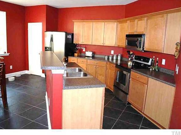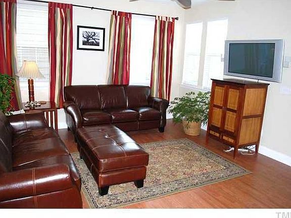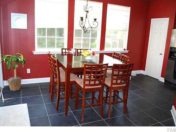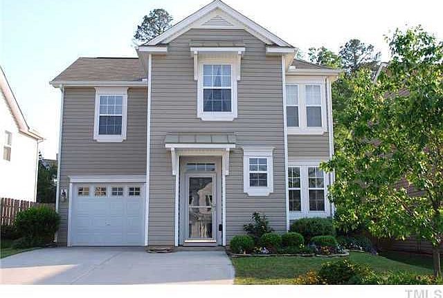 Beautiful & immaculate! Bright & open flr plan, lots of upgrades & flat landscaped lot w/6' priv fence & flag stone patio! Spacious LR has gas log fp w/slate, flat screen TV w/surround sound & lam hrdwds. Huge eat-in kitchen w/slate flr, brkfst nook, bar, SS appl incl frig, maple cabs,pantry & glass dr to patio. Master w/trey ceil & fan. Bonus/loft! Min to 540 & Triangle Towne Ctr!